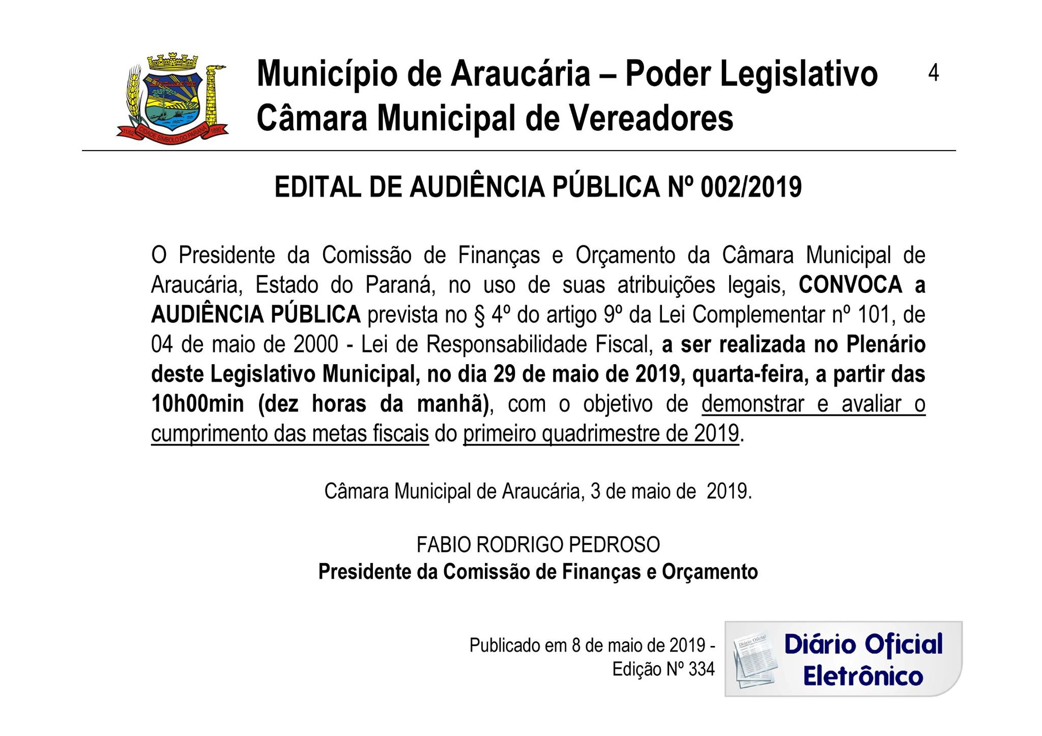 AUDIÊNCIA PÚBLICA DEMOSTRAÇÃO E AVALIAÇÃO DO CUMPRIMENTO DE METAS FISCAIS 1º QUADRIMESTRE 2019